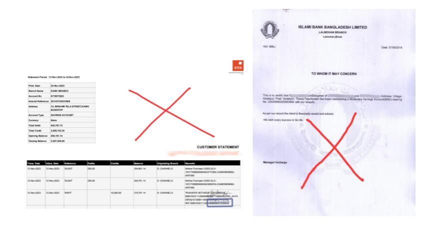 5.Photo or Xerox Copy Printed Bank Statement under students or parents name (ONLY) with official stamp or signature