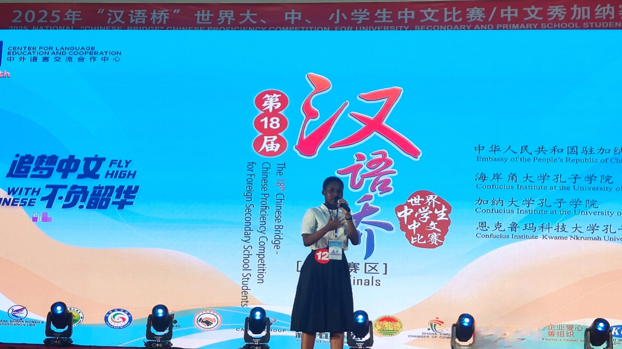 Nana Akua Abakoma Amoako is a student at the first teaching site of our school’s Confucius Institute — she is in Grade 2 of the Junior High School Affiliated to Kwame Nkrumah University of Science and Technology in Kumasi and has only studied Chinese for 8 months. In this competition, she achieved the highest score in the written test section due to her solid basic skills. In the speech section, she focused on the theme "FLY HIGH WITHCHINESE", telling the story of her learning Chinese and falling in love with it. She also used the phrase "Youth doesn't wait"(Qīng chūn bù děng rén)to encourage all the students to strive and persist, using Chinese as a bridge to achieve a wonderful life. In the talent performance section, Nana Akua Abakoma Amoako wore a beautiful classical dress and transported the audience through time and space with elegant dance moves, bringing them into the ancient capital of Chang'an. Finally, she won the first place in the secondary school group of the Ghana region with the highest total score.