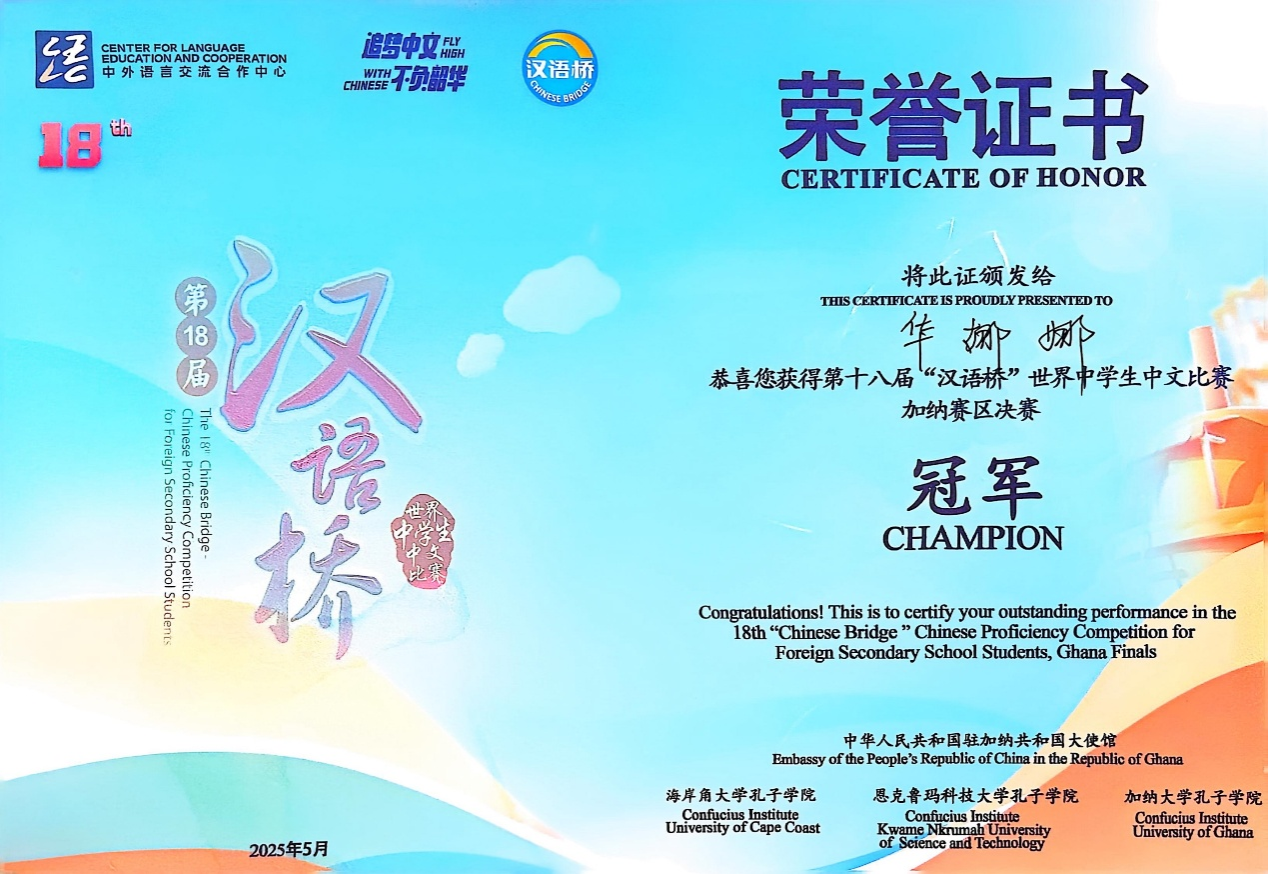 On March 18,2025,the 18th "Chinese Bridge" Chinese Proficiency Competition for Foreign Secondary School Students (Ghana Region) Final was successfully held at the University of Cape Coast. Our Confucius Institute student, Akua Abakoma Amoako, stood out among many contestants and won the championship of the middle school group in the Ghana region. Ambassador Tong Defa of the Chinese Embassy in Ghana presented her with the certificate and prizes.