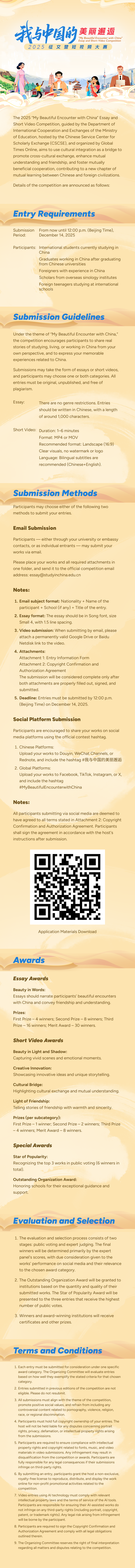 Under the theme of “My Beautiful Encounter with China,” the competition invites international students currently studying in China, graduates who have studied in China, foreign nationals with experience in China, scholars from overseas Sinology institutes, and foreign teenagers studying at international schools to tell authentic stories about China through essays or short videos. Participants are encouraged to share their personal experiences of studying, living, or working in China, and to convey the beauty of their encounters with the country.
